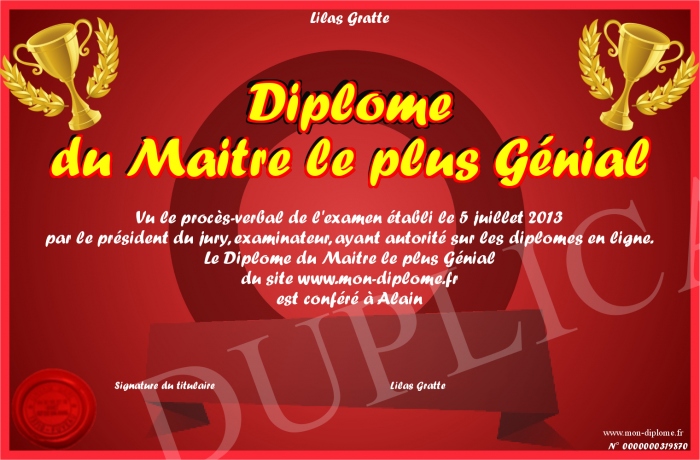 Envoyez par email votre Diplome du Maitre le plus Génial personalisé