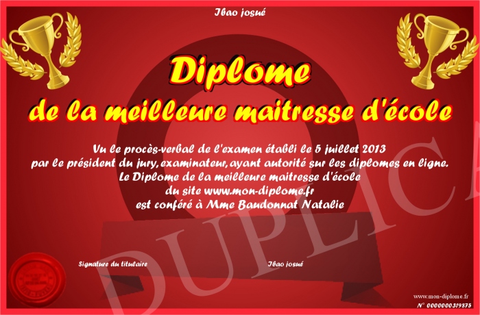 Envoyez par email votre Diplôme de la meilleure maitresse d'école personalisé