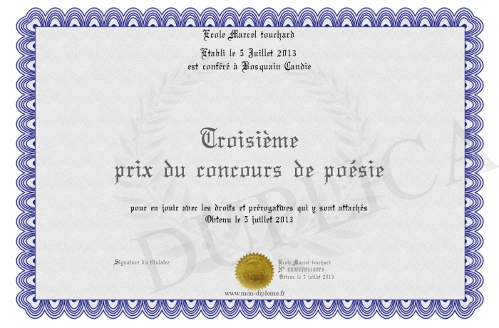 Envoyez par email votre Troisième prix du concours de poésie personalisé