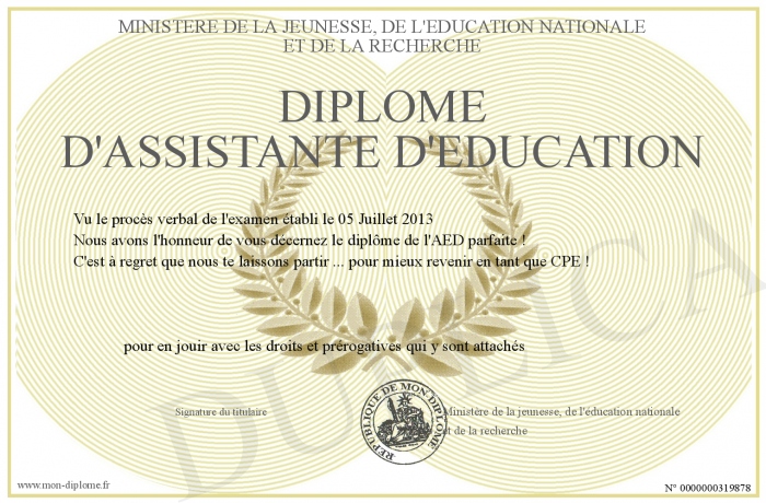 Envoyez par email votre Diplôme d'assistante d'éducation personalisé