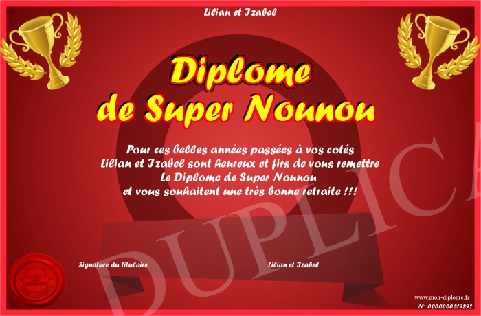 Envoyez par email votre Diplôme de Super Nounou personalisé