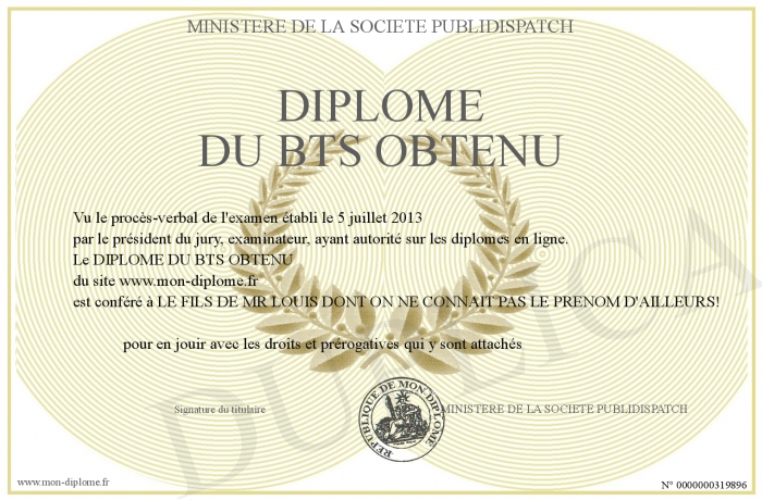 Envoyez par email votre DIPLOME DU BTS OBTENU personalisé