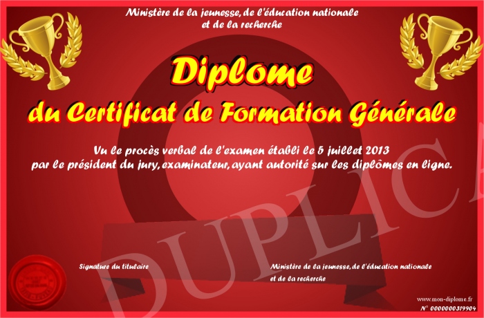 Envoyez par email votre Diplôme du Certificat de Formation Générale personalisé