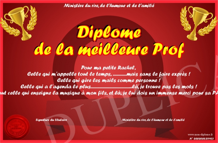 Envoyez par email votre Diplome de la meilleure Prof personalisé