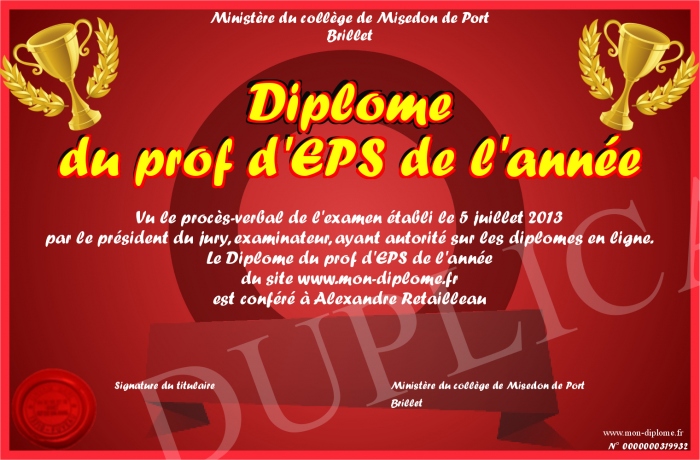 Envoyez par email votre Diplôme du prof d'EPS de l'année personalisé