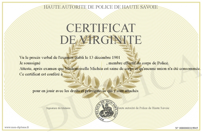 Envoyez par email votre Certificat de Virginité personalisé