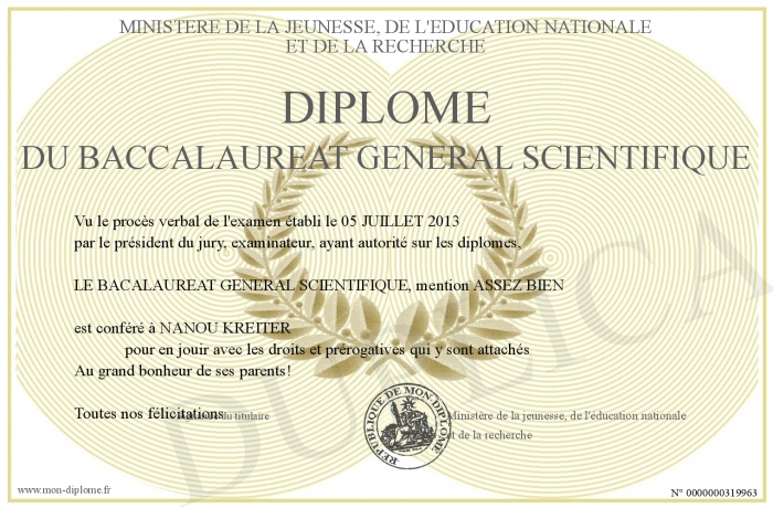 Envoyez par email votre Diplôme du baccalaureat général Scientifique personalisé