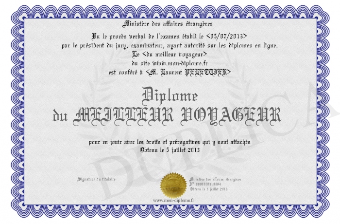 Envoyez par email votre Diplôme du MEILLEUR VOYAGEUR personalisé