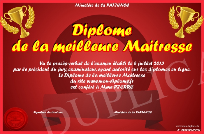 Envoyez par email votre Diplome de la meilleure Maitresse personalisé