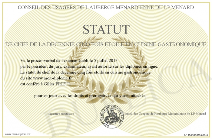 Envoyez par email votre statut de chef de la décennie cinq fois étoilé en cuisine gastronomique personalisé
