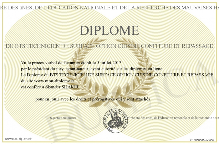 Envoyez par email votre Diplôme du BTS TECHNICIEN DE SURFACE OPTION CUISINE CONFITURE ET REPASSAGE personalisé