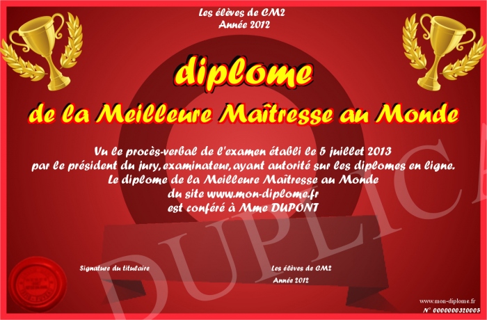 Envoyez par email votre diplome de la Meilleure Maîtresse au Monde personalisé