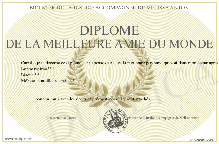 Envoyez par email votre Diplome de la meilleure amie du monde personalisé