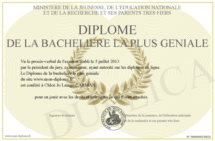 Envoyez par email votre Diplôme de la bachelière la plus géniale personalisé