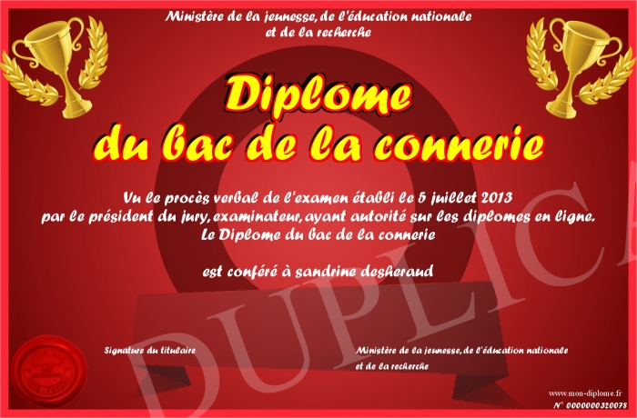 Envoyez par email votre Diplôme du bac de la connerie personalisé