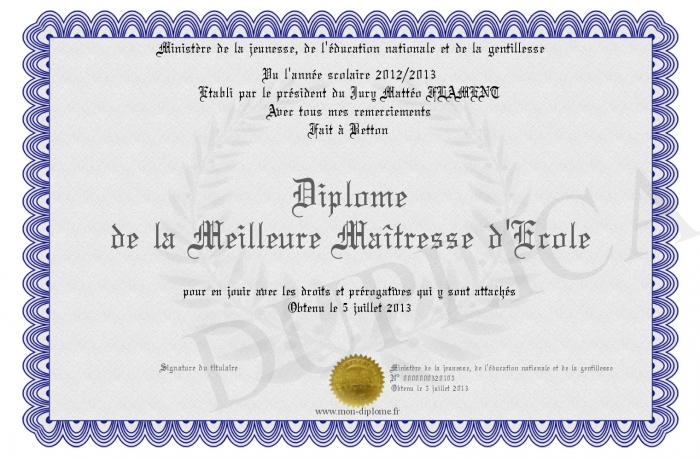 Envoyez par email votre Diplôme de la Meilleure Maîtresse d'Ecole personalisé