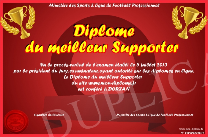 Envoyez par email votre Diplôme du meilleur Supporter personalisé