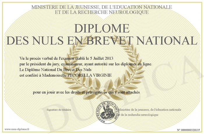 Envoyez par email votre Diplôme des NULS EN BREVET NATIONAL personalisé