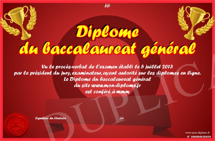 Envoyez par email votre Diplôme du baccalaureat général personalisé