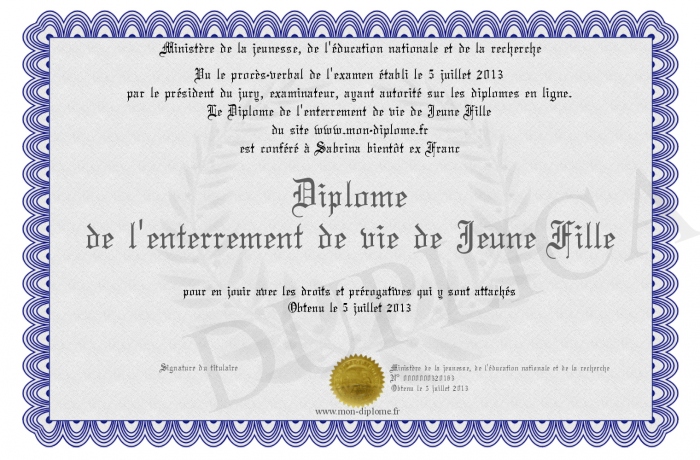 Envoyez par email votre Diplôme de l'enterrement de vie de Jeune Fille personalisé