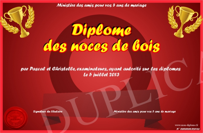Envoyez par email votre Diplôme des noces de bois personalisé