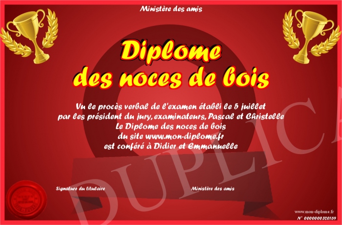 Envoyez par email votre Diplôme des noces de bois personalisé