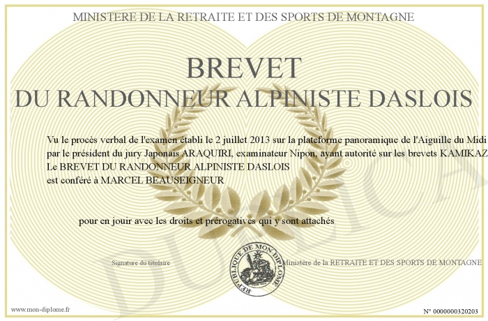 Envoyez par email votre BREVET DU RANDONNEUR ALPINISTE DASLOIS personalisé