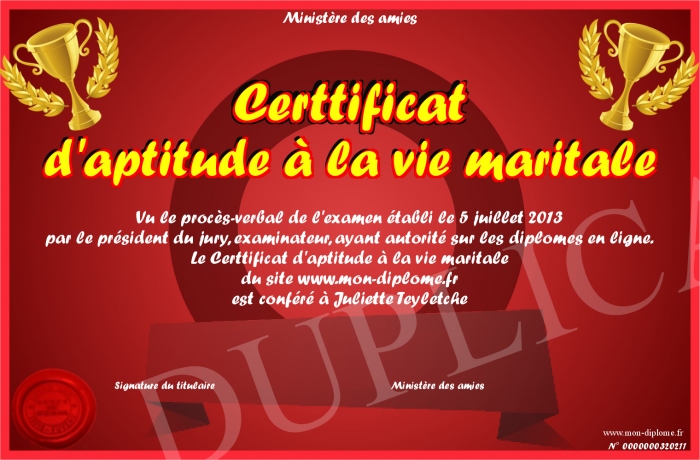 Envoyez par email votre Certtificat d'aptitude à la vie maritale personalisé