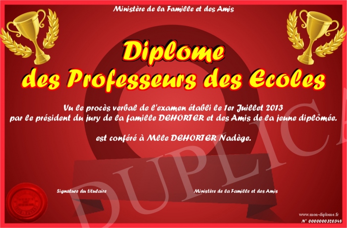 Envoyez par email votre Diplôme des Professeurs des Ecoles personalisé