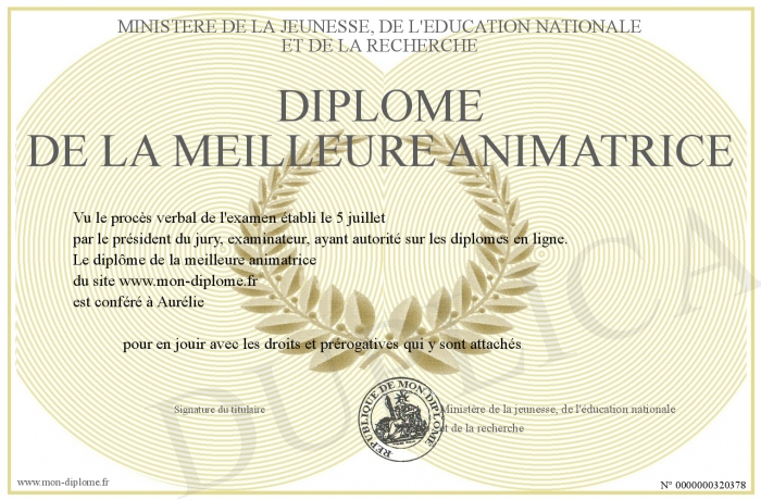 Envoyez par email votre Diplôme de la meilleure animatrice personalisé