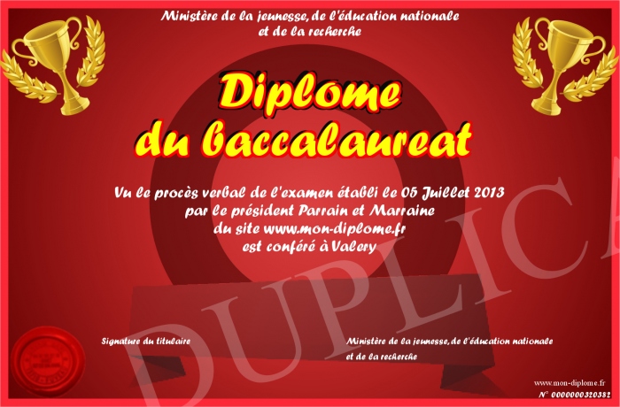Envoyez par email votre Diplôme du baccalaureat personalisé