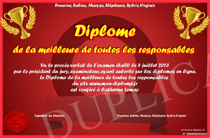 Envoyez par email votre Diplôme de la meilleure de toutes les responsables personalisé