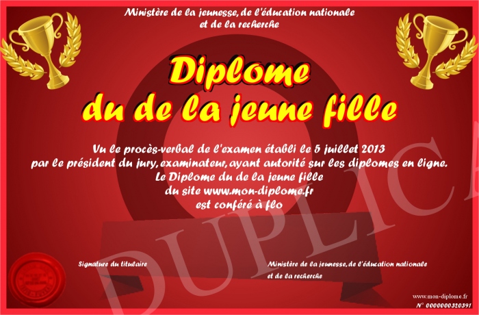 Envoyez par email votre Diplôme du de la jeune fille personalisé