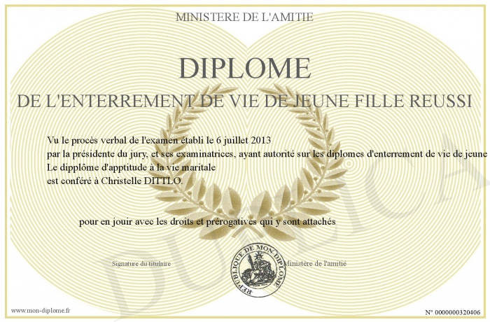 Envoyez par email votre Diplôme de l'enterrement de vie de jeune fille réussi personalisé