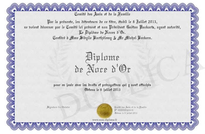 Envoyez par email votre Diplôme de Noce d'Or personalisé