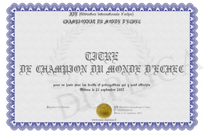 Envoyez par email votre TITRE DE CHAMPION DU MONDE D'ECHEC personalisé