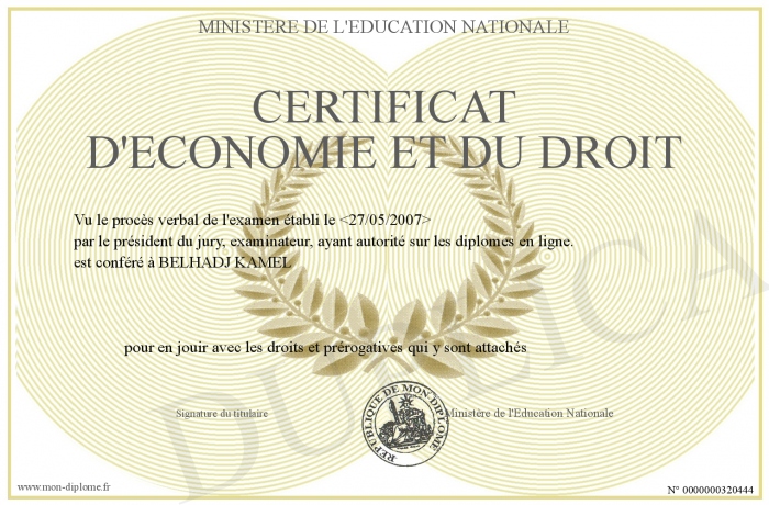 Envoyez par email votre Certificat d'Economie et du Droit personalisé