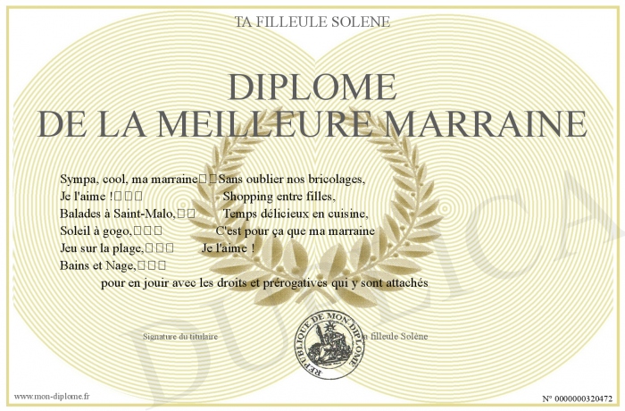 Envoyez par email votre Diplôme de la meilleure marraine personalisé