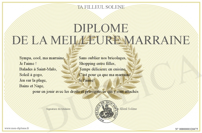 Envoyez par email votre Diplôme de la meilleure marraine personalisé