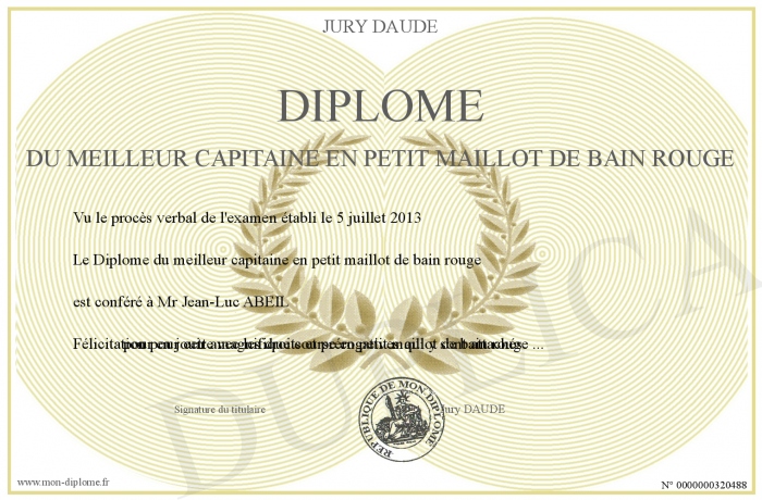 Envoyez par email votre Diplôme du meilleur capitaine en petit maillot de bain rouge personalisé