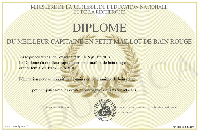 Envoyez par email votre Diplôme du meilleur capitaine en petit maillot de bain rouge personalisé