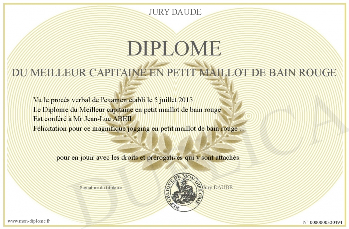 Envoyez par email votre Diplôme du Meilleur capitaine en petit maillot de bain rouge personalisé