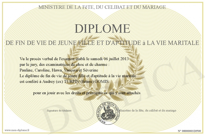 Envoyez par email votre Diplôme de fin de vie de jeune fille et d'aptitude à la vie maritale personalisé