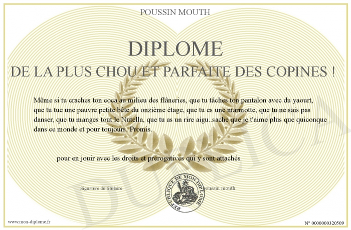 Envoyez par email votre Diplôme de la plus chou et parfaite des copines ! personalisé