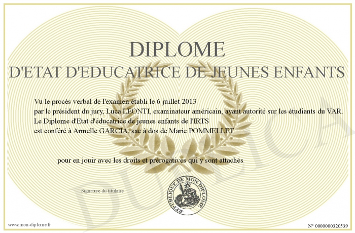 Envoyez par email votre Diplôme d'Etat d'éducatrice de jeunes enfants personalisé