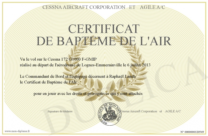 Envoyez par email votre Certificat de Baptème de l'AIr personalisé