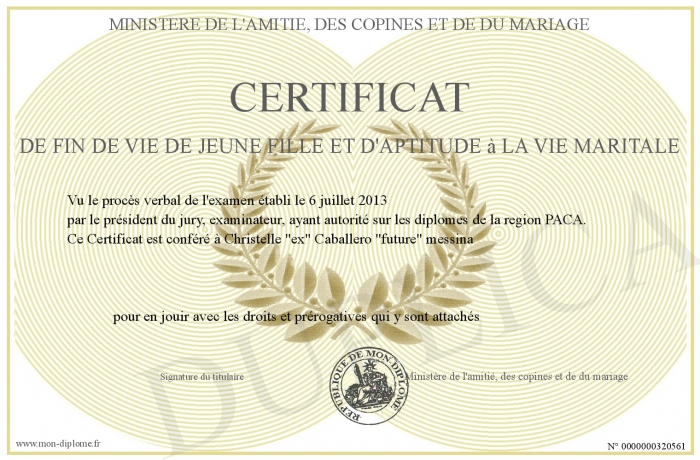 Envoyez par email votre CERTIFICAT de fin de vie de jeune fille et d'aptitude à la vie maritale personalisé