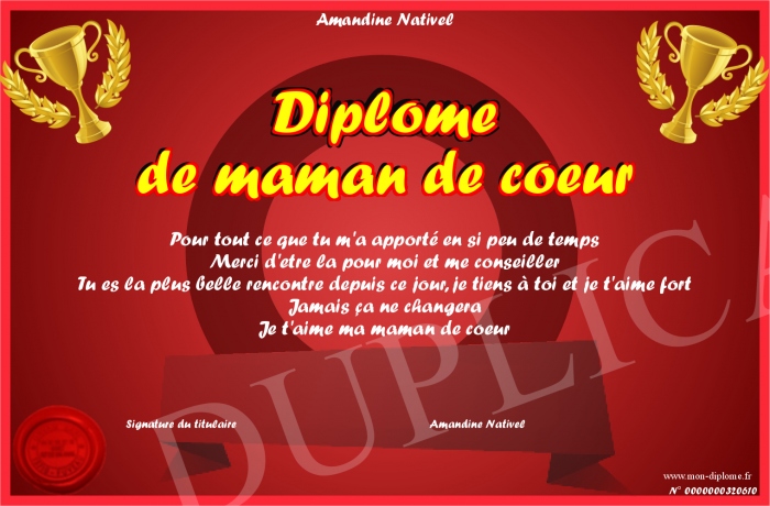 Envoyez par email votre Diplôme de maman de coeur personalisé