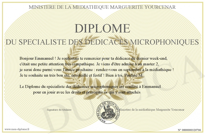 Envoyez par email votre Diplôme du spécialiste des dédicaces microphoniques personalisé