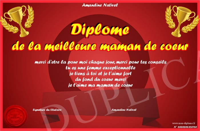 Envoyez par email votre Diplôme de la meilleure maman de coeur personalisé